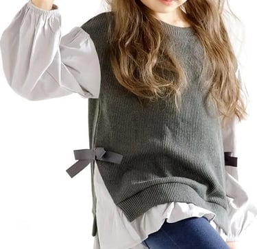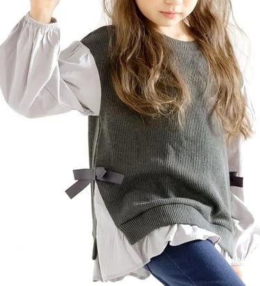 重ね着風デザインが可愛い女の子用トップス。シャツ×ニットのフェイクレイヤードで、おしゃれに見える1枚。柔らかく快適な着心地で、秋冬コーデにぴったり。リボン付きでガーリーな印象に。