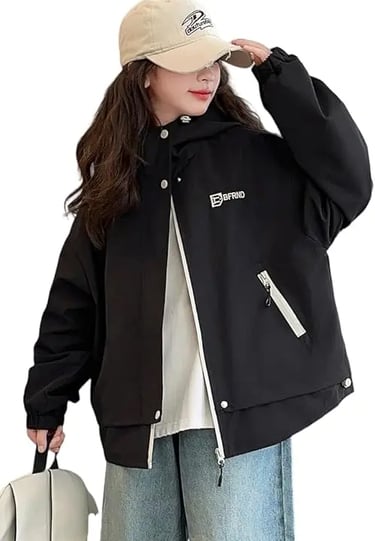 女の子用ウィンドブレーカー(軽量ジャケット)。防風・撥水加工で春秋冬のアウトドアや通学に最適。前開きジッパーとゴム入り袖口で着脱も簡単。柔らかく快適な着心地で、カジュアルな韓国風デザイン。