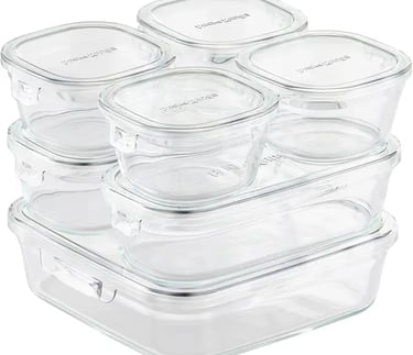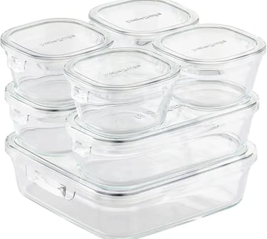 耐熱ガラス製の保存容器7点セット(1.2L×1、500ml×2、200ml×4)。電子レンジ・オーブン使用可(フタはオーブン不可)。耐熱フタ付きで収納・調理・保存に便利。